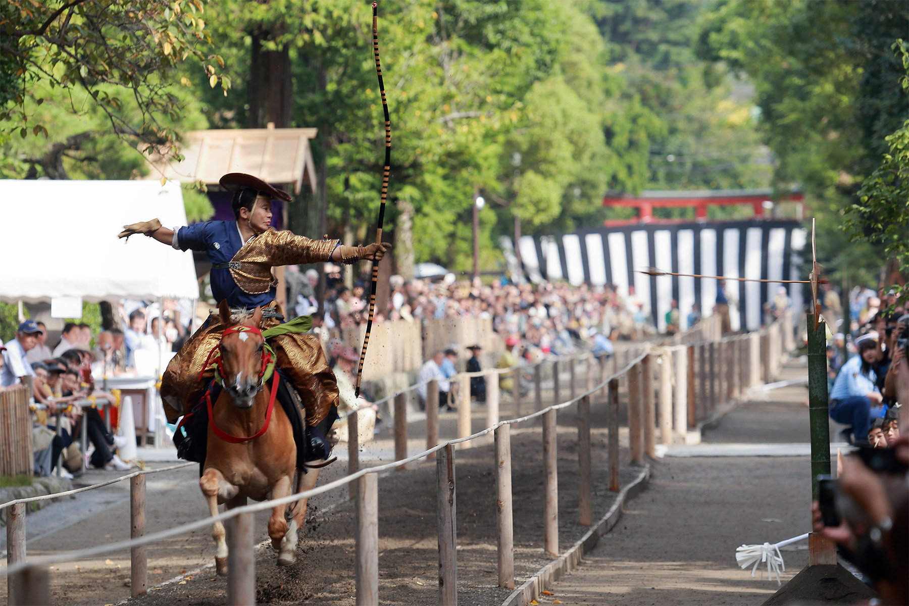 | (撮影者のコメント) 益荒雄の幸矢手挟み立ち向かひ射る的方は見るに清けし…由比ヶ浜の方向に鮮やかに矢が放たれる景色は、この万葉歌を彷彿させました。 |