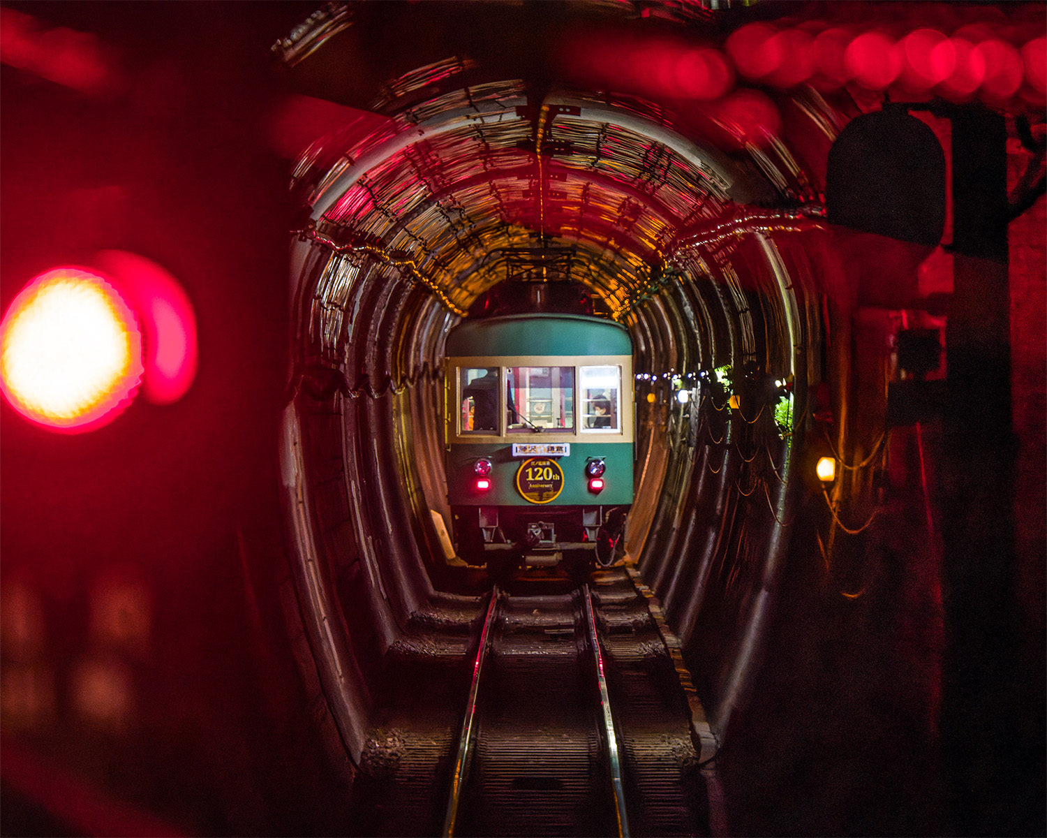 昼間は暗い極楽洞。実は内部に照明があり、夜は極楽寺の深い闇の中で青白く不気味に浮かび上がっています。そこに江ノ電が来ると、トンネルの向こうの異界に吸い込まれていくようでした。